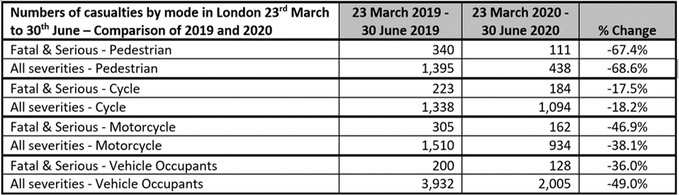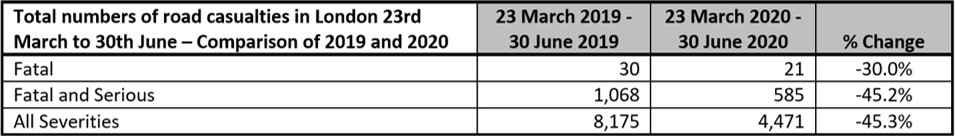 - In London, data from TfL allows us to isolate the period from the start of the lockdown to the end of June only; for this 13-week period, fatal and serious casualties were down by 45% and pedestrian casualties fell by around 67%. Cycling casualties were down to a lower extent (-17%) but this is potentially because many more people took up cycling during the first lockdown.
