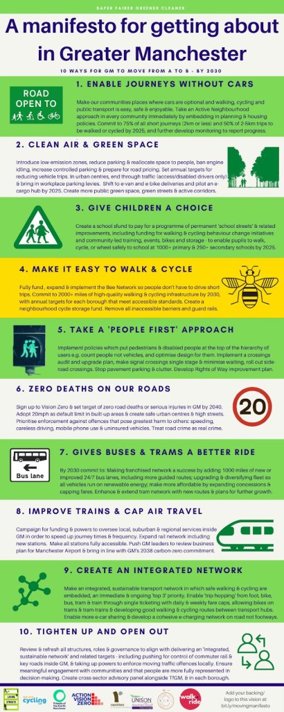 The coalition of groups – WalkRideGM, Living Streets, Friends of the Earth Manchester, Cycling UK, Unison Manchester , The Ramblers and ourselves – have a total of 10 asks as part of their manifesto for Getting About in Great Manchester one of which is Zero Deaths on our Roads – which asks the candidates to: