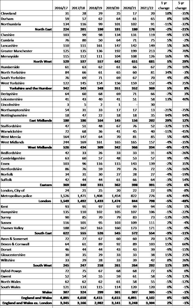 - Comparisons at force level should be made with caution due to regional collaborations. Additionally, police functions data are often affected by re-structuring within police forces. Therefore, comparisons over time for specific functions should be made with caution.