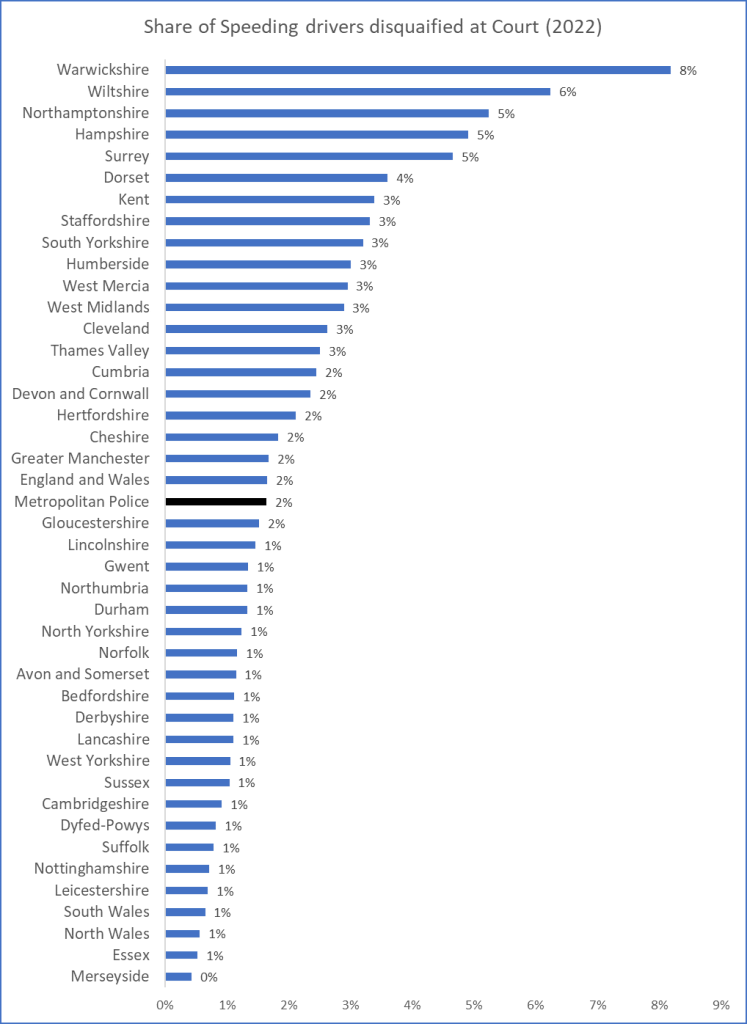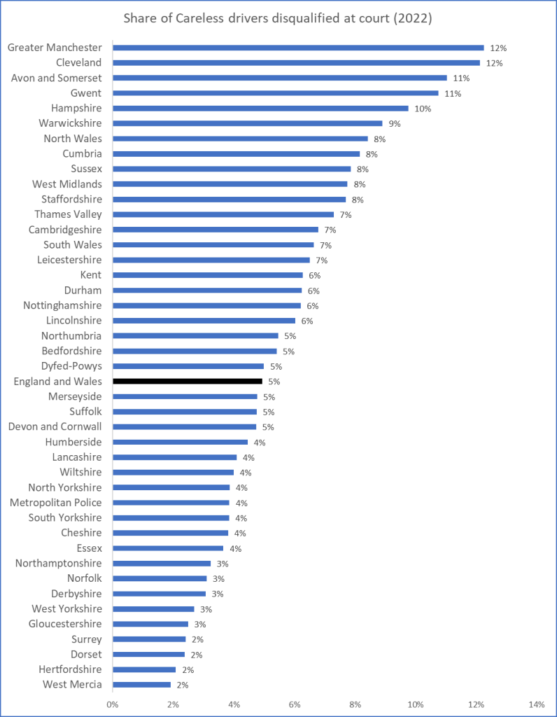 And again, as with speeding, there was a wide range across magistrate areas. This ranged from a high of 12% in Greater Manchester and Cleveland to 2% in Surrey, Dorset, Hertfordshire and West Mercia.