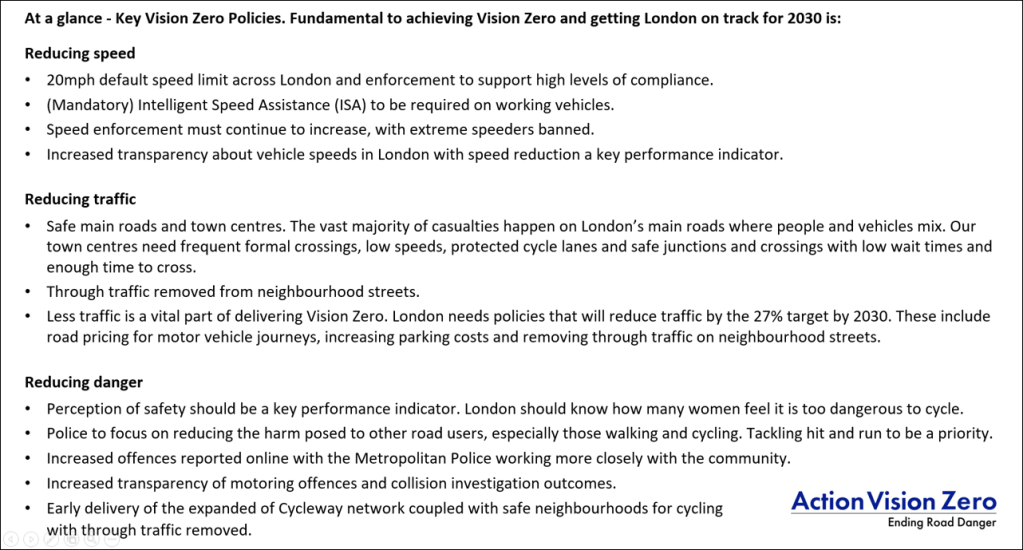 Our asks focus on the safe system approach PLUS a key element for road danger reduction – reducing traffic levels. There are sections on reducing speeds, enforcement and the role that the Metropolitan Police play, reducing traffic, making vehicles safer especially for those walking and cycling, creating safe streets and how to learn better from collisions that occur and how to improve the justice system.