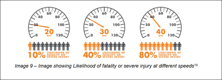 20mph. The strategy references 20mph as a safe speed for roads shared with people walking and cycling as this carries a 10% risk of death or severe injury for a pedestrian in a crash (see graphic below (page 29)). Oxfordshire is committed to rolling out 20mph to the vast majority of its towns and villages (82%), but it is these shared main roads which carry the highest risk and the greatest need for reduced speed.