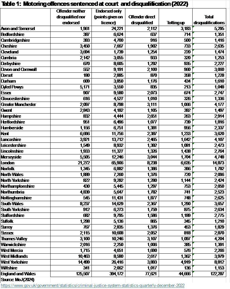 See Table 1 to see how many disqualifications were given in your area in 2022. Most of these will be for drink/drug driving offences (Table 2). Table 3 and 4 shows how few bans are given for drivers convicted of individual cases of speeding and careless driving. The number of bans given with totting up are also shown and refer to the offence which took the penalty points to 12 or over.