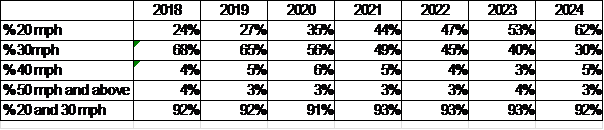 So, it is good to be able to report the increase in 20 mph offences in the first half of 2025 (See Tables 1 and 2 overleaf). In total, 62% of all reported KSIs occur on 20 mph roads (see Tables 3 and 4 overleaf); this includes 76% of cyclist KSIs and 68% of pedestrian KSIs.[1]