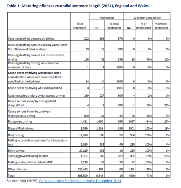 Table 1: Motoring offences custodial sentence length (2024), England and Wales