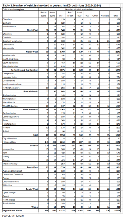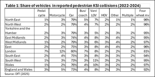 - Apart from London, the findings were quite similar across the police regions, with four-wheel motor vehicles, especially cars, accounting for the vast majority of pedestrian KSIs.