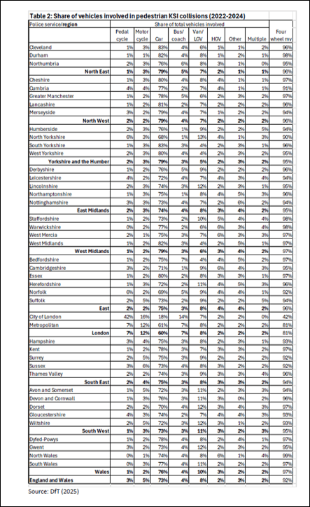 - Only in London was there a higher share of pedestrian KSIs involving motorcyclists (12%) and cyclists (7%), with cars down to 60%.