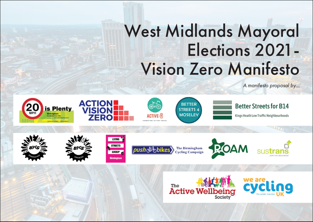 A coalition of groups has come together to call on the Mayoral candidates to address the region’s lack of progress in reducing casualties in recent years and to adopt a set of policies which will start to address the toll of road casualties with a Vision Zero target that by 2040 no one will be killed or injured on the roads in the West Midlands. Once adopted, these policies will at the same time help tackle other key issues such as improving air quality, reducing CO2 emissions and improving public health by enabling more people to walk and cycle.