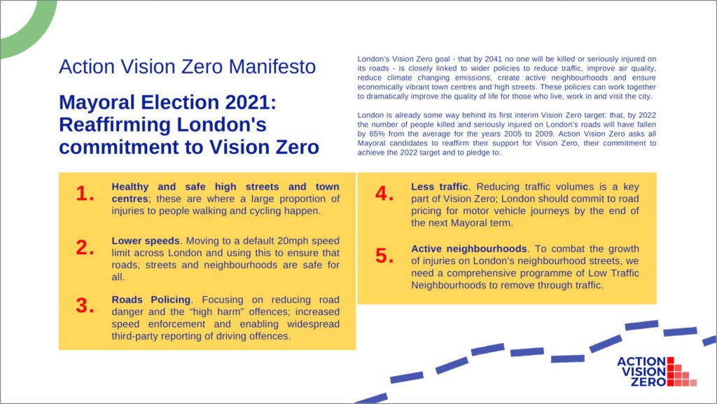 In London there are elections for the London Mayor and the Greater London Assembly. Action Vision Zero has published a manifesto with asks for London mayoral candidates. London has already adopted Vision Zero with a target date that by 2041 there will be no fatal or serious casualties on London’s roads. Our manifesto acknowledges the progress that London has made but asks the new Mayor to go further, in particular around: